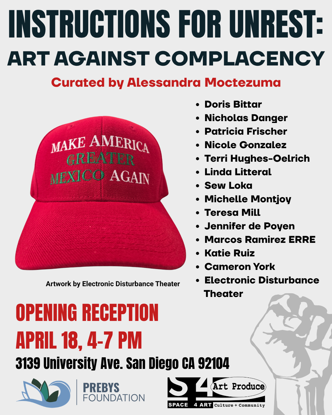 The exhibit includes artists: Doris Bittar, Jennifer de Poyen, Electronic Disturbance Theater (EDT), Patricia Frischer, Terri Hughes-Oelrich, Linda Litteral, Nicole Gonzalez, Nick McPherson (Nicholas Danger), Teresa Mill, Michelle Montjoy, Marcos Ramirez ERRE, Katie Ruiz, Cameron York, and Claudia Biezunski-Rodriguez (Sew Loka).