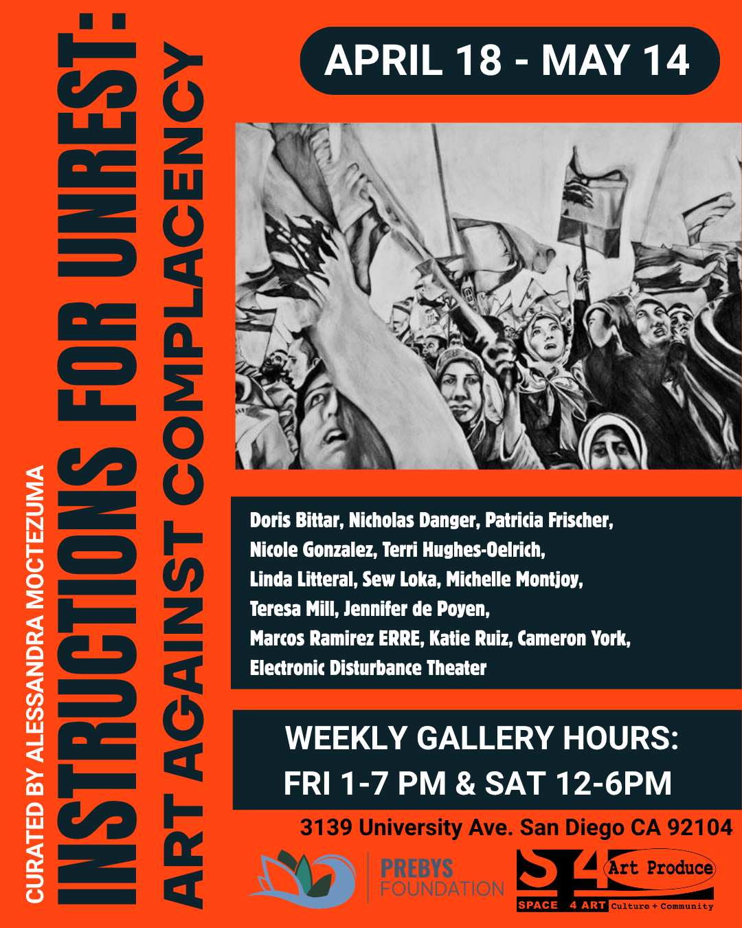 SAN DIEGO, CA— Space 4 Art presents Instructions for Unrest: Art Against Complacency, a group exhibition curated by Alessandra Moctezuma, Gallery Director and Professor of Fine Art at San Diego Mesa College. The third in a series of exhibitions at Art Produce Gallery in 2026, the exhibition opens with a public reception on April 18 from 4-7 p.m. and will remain on view through May 14. In keeping with Space 4 Art’s mission to promote meaningful dialogue and creative exchange, Moctezuma will lead a Conversation with the Artists on Thursday, May 14 from 6-8 p.m.