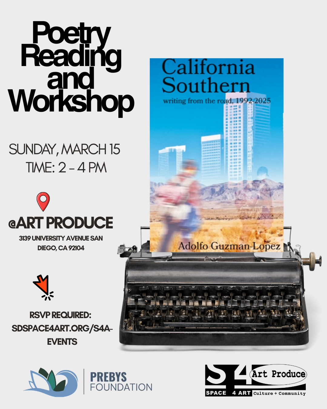 Poet and journalist Adolfo Guzman-Lopez, co-founder of the Taco Shop Poets and reporter for LAist, will lead a workshop and reading centered on his new book, California Southern: writing from the road, 1992–2025, which reflects on his life as a Mexican-American and his mother’s work cleaning homes in San Diego. The workshop invites participants whose family members did domestic work to write about their experiences and share their pieces in a community reading.